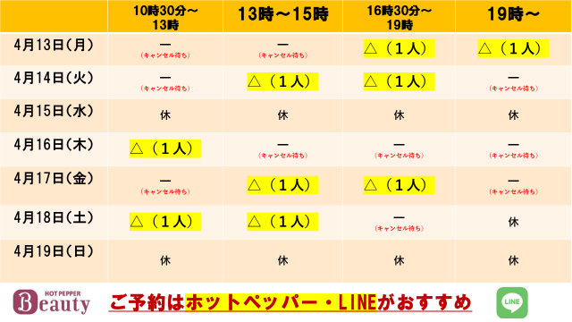 - ○:残り2人 △:残り1人 ━:ご予約が難しいです