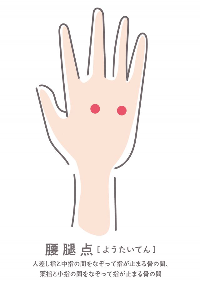 腰痛の緩和に効果的なツボはいくつかありますが、今回は自分でツボ刺激ができる場所をふたつご紹介します。