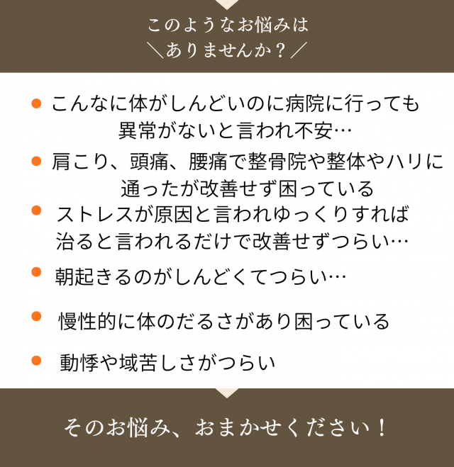特定の場所だけでなく、全身に多種多様な不調(不定愁訴)が現れるのが特徴です。